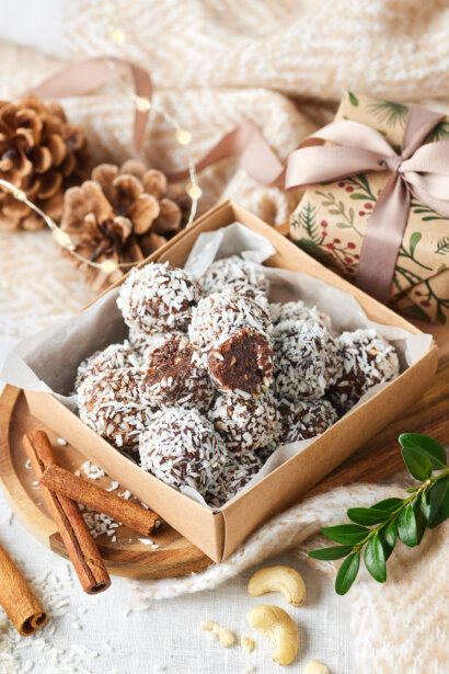 2. No trifeļu masas veido nelielas bumbiņas, un katru bumbiņu apviļā kokosriekstu skaidiņās.