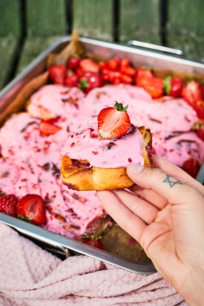 7. Bulciņām ļauj atdzist, tad pārsmērē tās ar glazūru un izdekorē ar zemenēm.