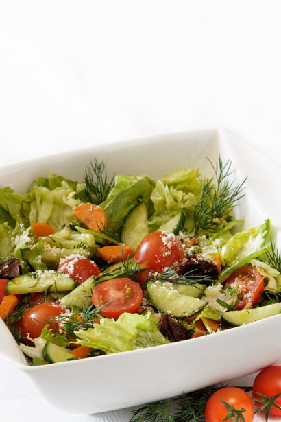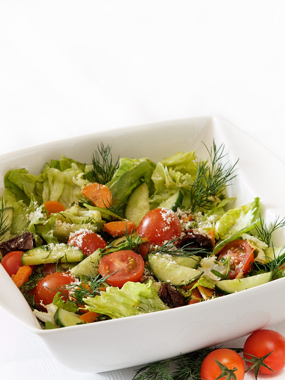 Salātiem pārkaisa rīvētu parmezāna sieru un viegli pārlej ar sojas mērci.