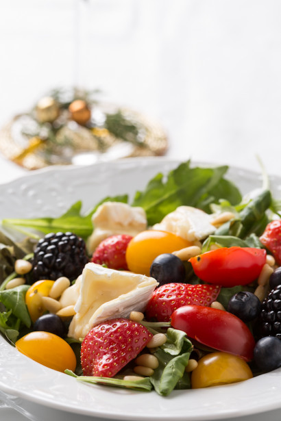 3. Ķiršu tomātiņus pārgriež uz pusēm un kārto virs salātiem.