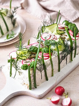6. Izņem no veidnes, apsmērē malas ar atlikušo krēmu no visām pusēm. Dekorē ar svaigiem zaļumiem, redīsu un gurķu šķēlītēm, ķirbju sēklām un citu, kas piestāv vai ir pieejams.