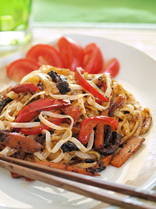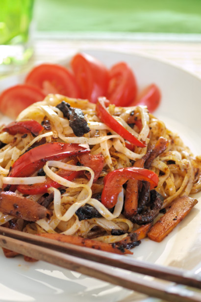 5. Ēdienu pasniedz siltu – nūdeles iemaisot gaļas mērcē. Pārkaisa ar smalki sakapātiem zaļajiem lociņiem.