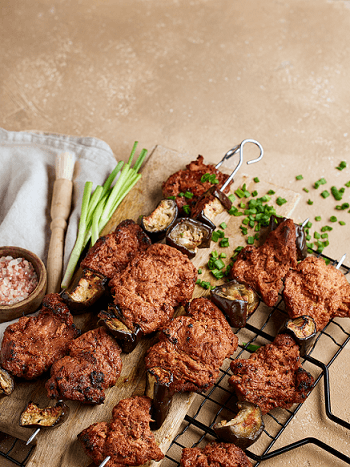 6. Sagatavo grilu. Uz iesmiņiem dur pamīšus sojas gabalus un baklažānu.