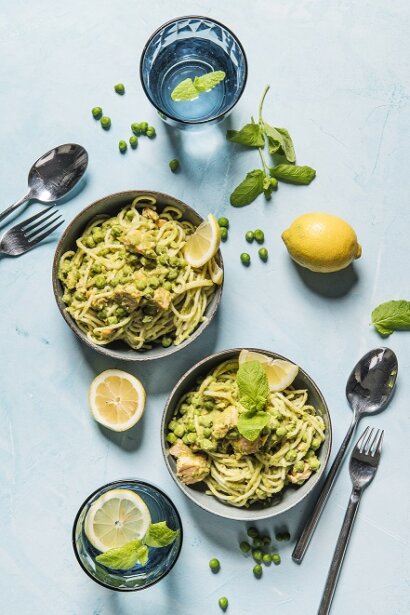 2. Tikmēr virtuves kombainā liek pusi zirnīšu, piparmētru, pesto, pastas ūdeni un ķiploku. Samaļ.