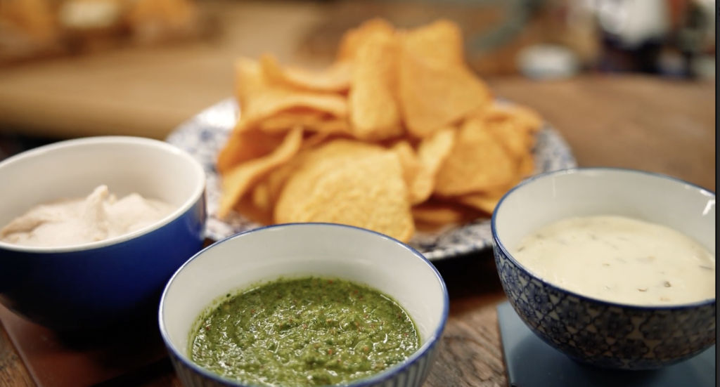 2. Gatavo koriandra salsu: sīpolu un ķiploku nomizo, kinzu sasmalcina. Pievieno laima sulu, olīveļļu, sāli un