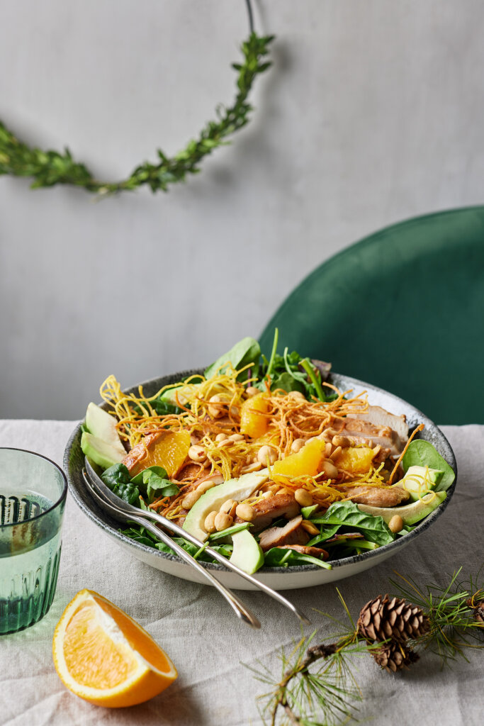 5. Lielā bļodā vai šķīvī liek salātu maisījumu, avokado, apelsīnu un vistas šķiņķīšus.