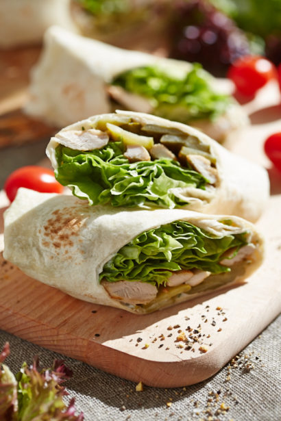 Liek kopā wrap: tortilju apziež ar mērci, virsū mērcei kārto gurķi, vistu un salātlapas. Visu ietin, aiztaisot ciet galus. Liek atkal krāsnī uz 1–2 minūtēm, lai uzsilst. Pasniedz nekavējoties.