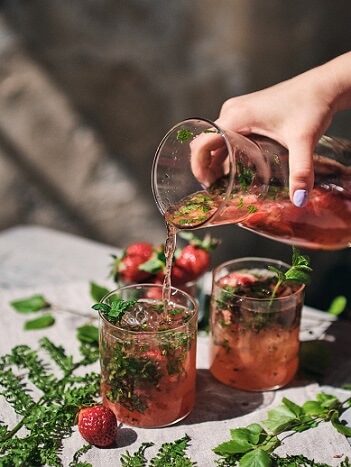 3. Glāzē dzērienu lej cauri sietiņam un garnē ar svaigām piparmētrām.