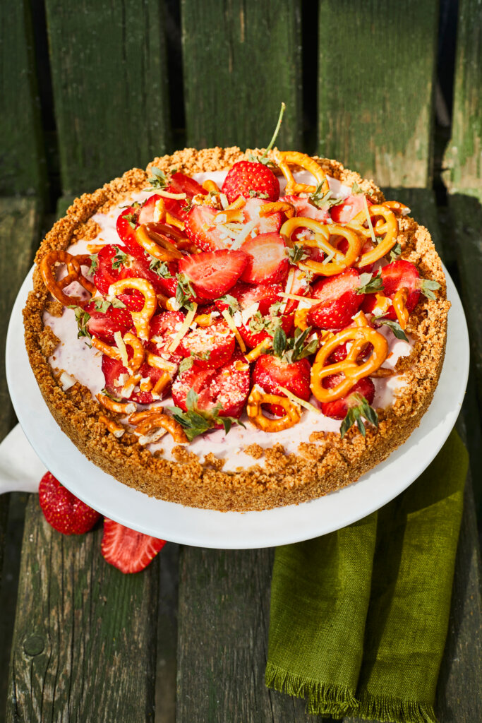 6. Kad kūka atdzisusi, dekorē to ar zemenēm, piparmētrām, citrona miziņu un sadrupinātiem Pretzel cepumiem.