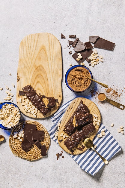 3. Kad batoniņu masu izņem no saldētavas, tai pāri pārber grauzdētus zemesriekstus. Pēc tam visu pārklāj melnajā šokolādē un atkal liek saldētavā uz stundu.